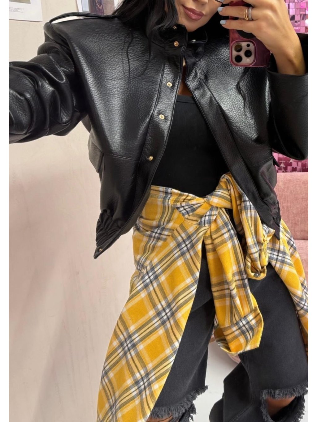 Koženka RAVEN – čierna je kúsok, ktorý nikdy nevyjde z módy 🖤 Je vyrobená z kvalitného eko-koženého materiálu s jemnou textúrou, ktorý pôsobí luxusne a dodáva outfitu moderný a sebavedomý look. Strih je pohodlný a univerzálny v UNI veľkosti (XS–XL), doplnený o praktické vrecká a detaily so zlatými gombíkmi, ktoré celý model povyšujú na štýlový must-have.