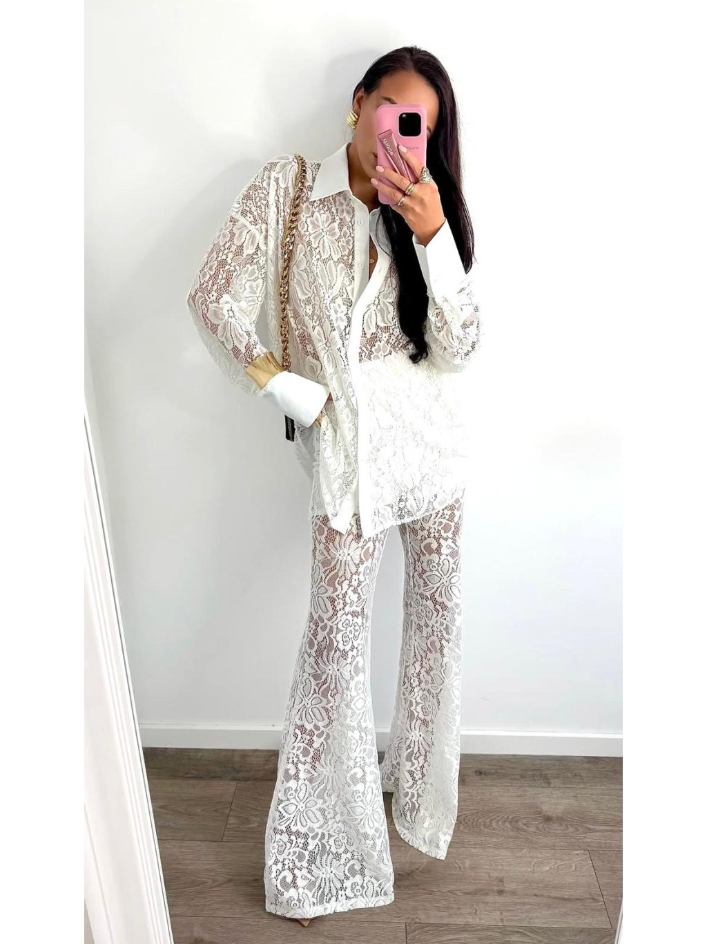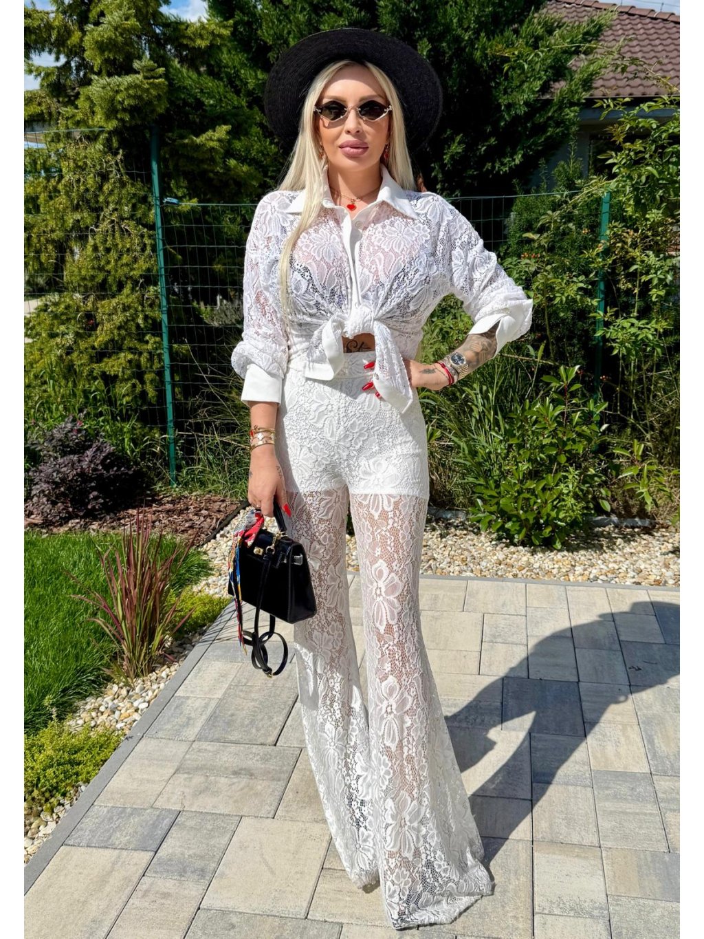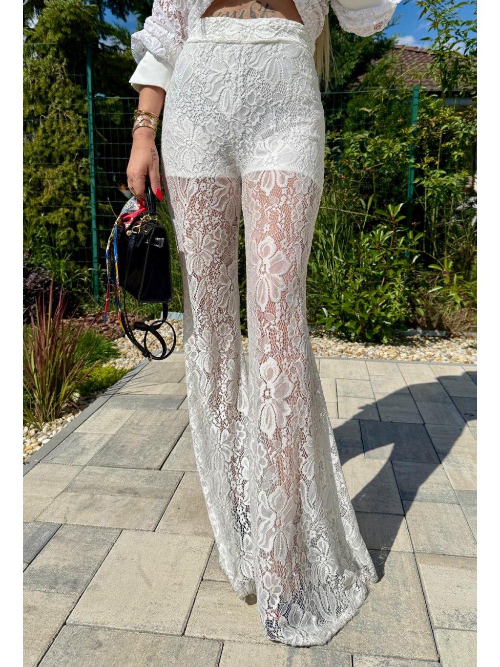 Tento luxusný kúsok je stvorený pre ženy, ktoré milujú odvážnu módu a neboja sa zažiariť! Biela krajka v kombinácii s polotransparentným dizajnom pôsobí elegantne a sofistikovane, zatiaľ čo zvonový strih dodáva nohaviciam trendy retro nádych.