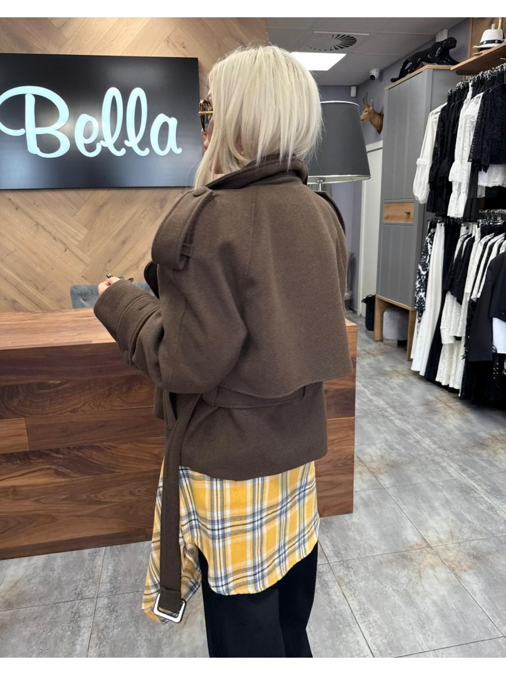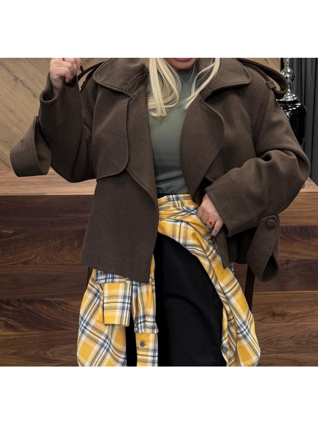 ✨ Krátky, no výrazný – kabátik CHOCO je stelesnením elegancie s nádychom originality. Jeho rafinovaný strih s veľkým golierom a voľnejšou siluetou pôsobí luxusne, no zároveň pohodlne. Hnedý odtieň je univerzálny a ľahko kombinovateľný, či už s rifľami, šatami alebo sukňou.