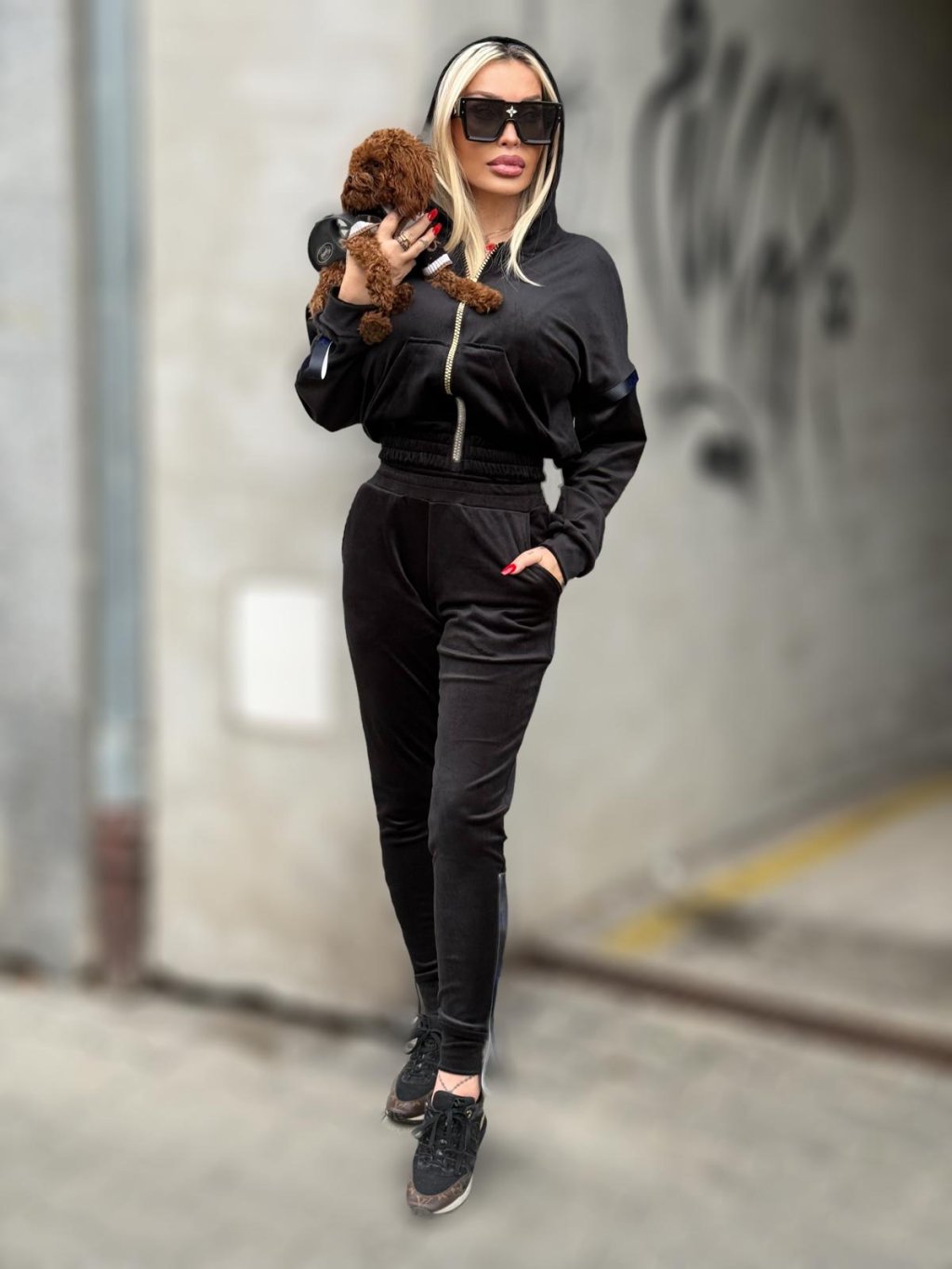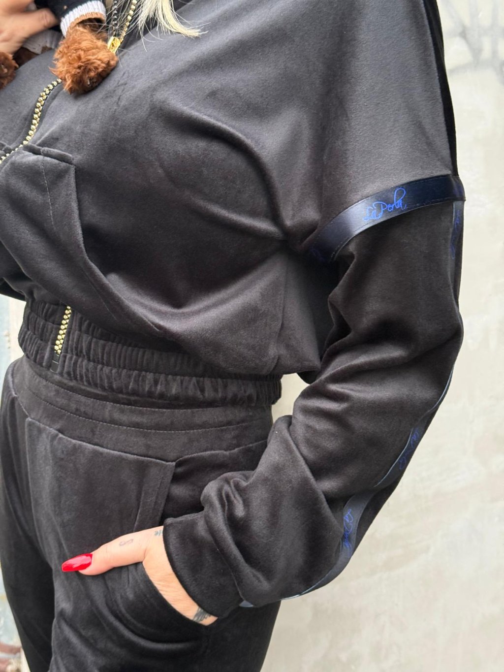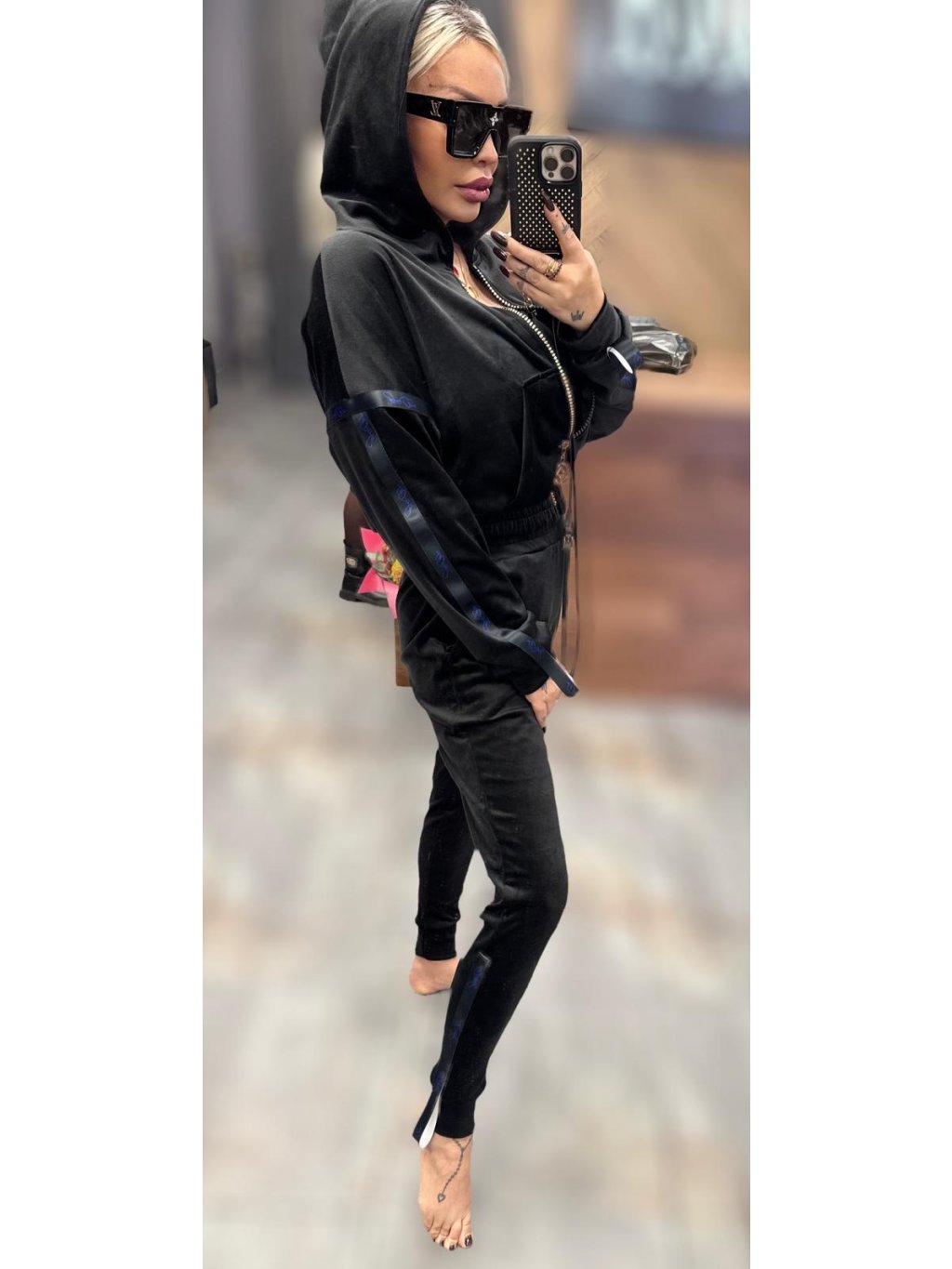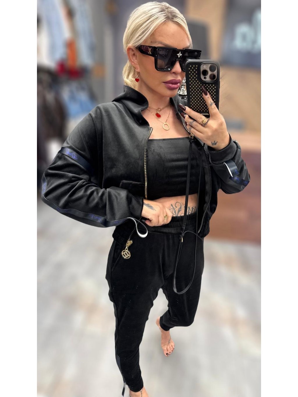 Trojkomplet obsahuje mikinu na zips s kapucňou, top bez ramienok a tepláky s elastickým pásom, takže ponúka množstvo možností na kombinovanie. Po bokoch nohavíc a rukávoch sa tiahne saténová stuha s logom La Perla v odtieňoch čiernej a modrej – detail, ktorý okamžite pôsobí luxusne. Zlatý zips na mikine pridáva eleganciu a krásne kontrastuje s tmavými tónmi.