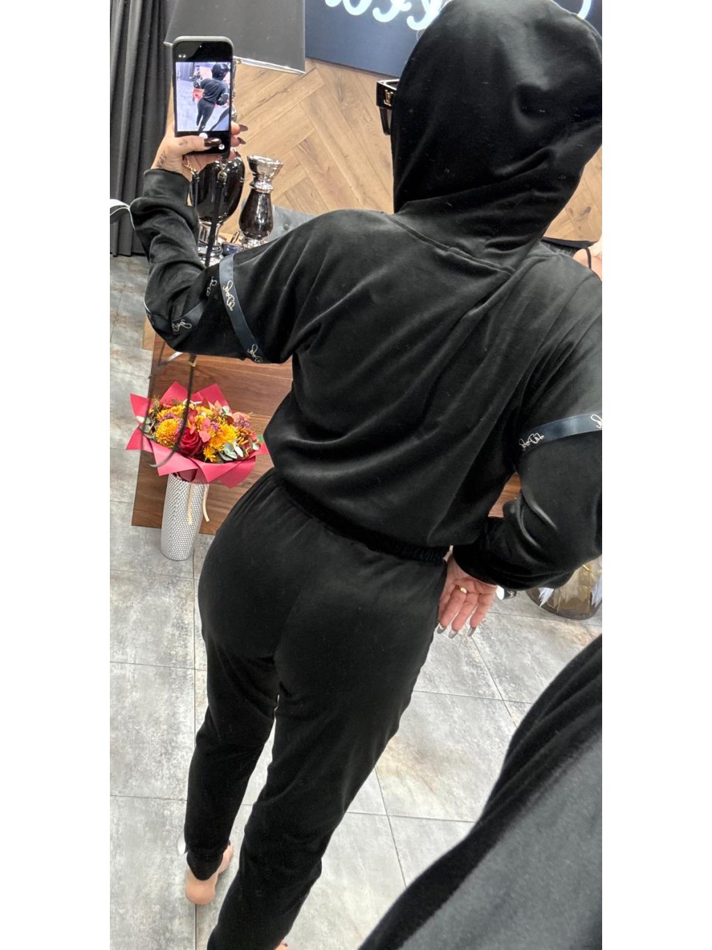 Tento trojkomplet obsahuje mikinu na zips s kapucňou, top bez ramienok a tepláky s elastickým pásom, vďaka čomu pôsobí zladeným a luxusným dojmom. Po stranách nohavíc a rukávoch prechádza saténová stuha s logom La Perla v zlatom odlesku, ktorá okamžite pozdvihne celý outfit. Zlatý kovový zips na mikine len podčiarkuje prémiový charakter celku a vytvára sofistikovaný kontrast s čiernou.