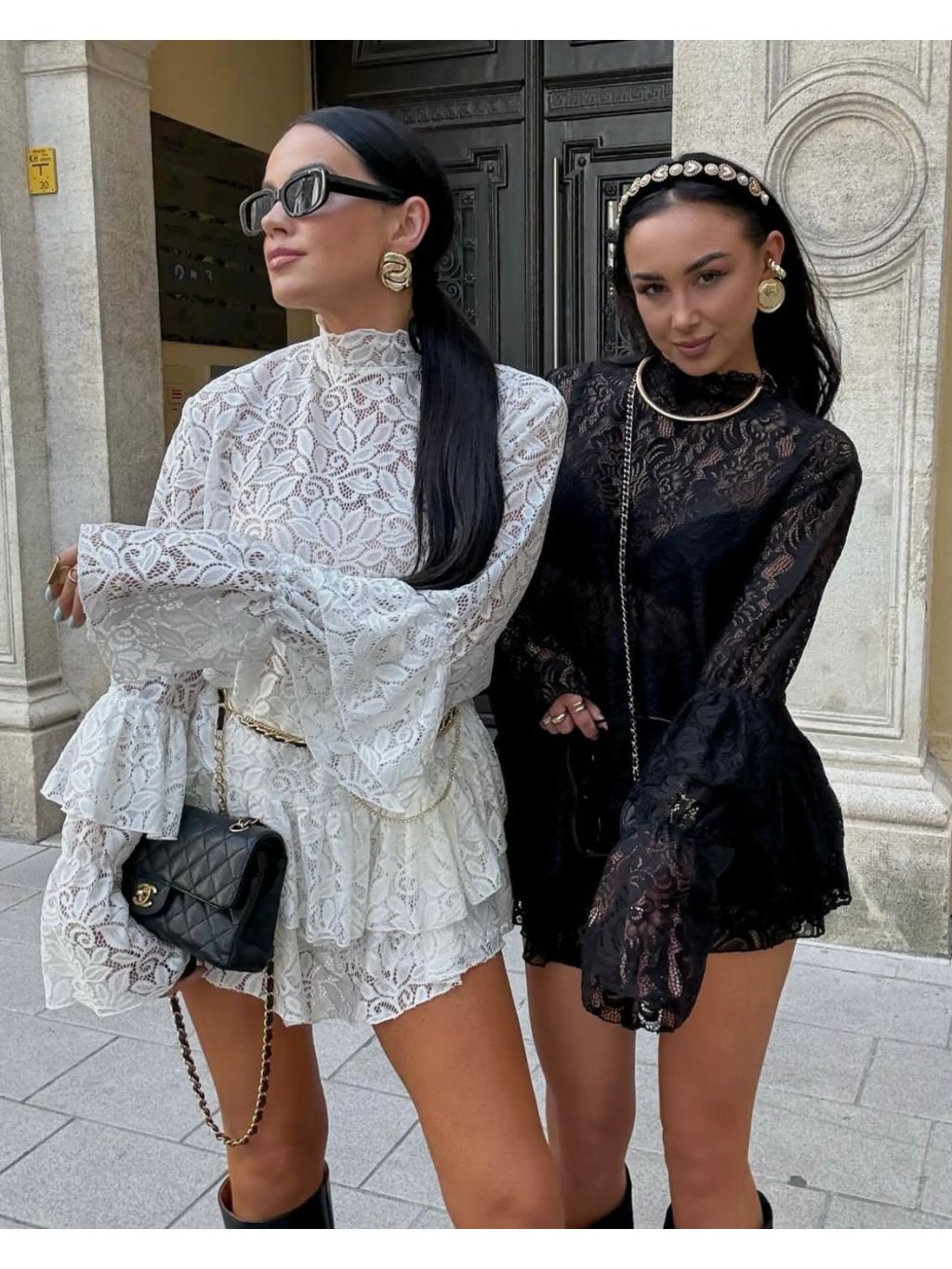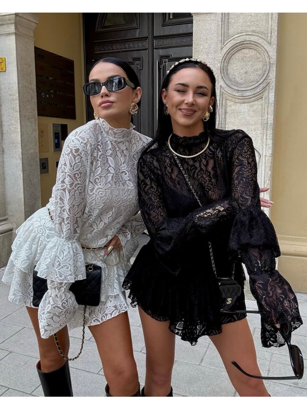 Jemná, éterická a neprehliadnuteľne ženská – blúzka LUCENTE je kúskom, ktorý vyžaruje anjelskú čistotu a eleganciu. 🤍 Bohato zdobená krajka s detailným kvetinovým vzorom pôsobí luxusne a vďaka volánom na spodnom leme a rukávoch získava ešte romantickejší nádych.
