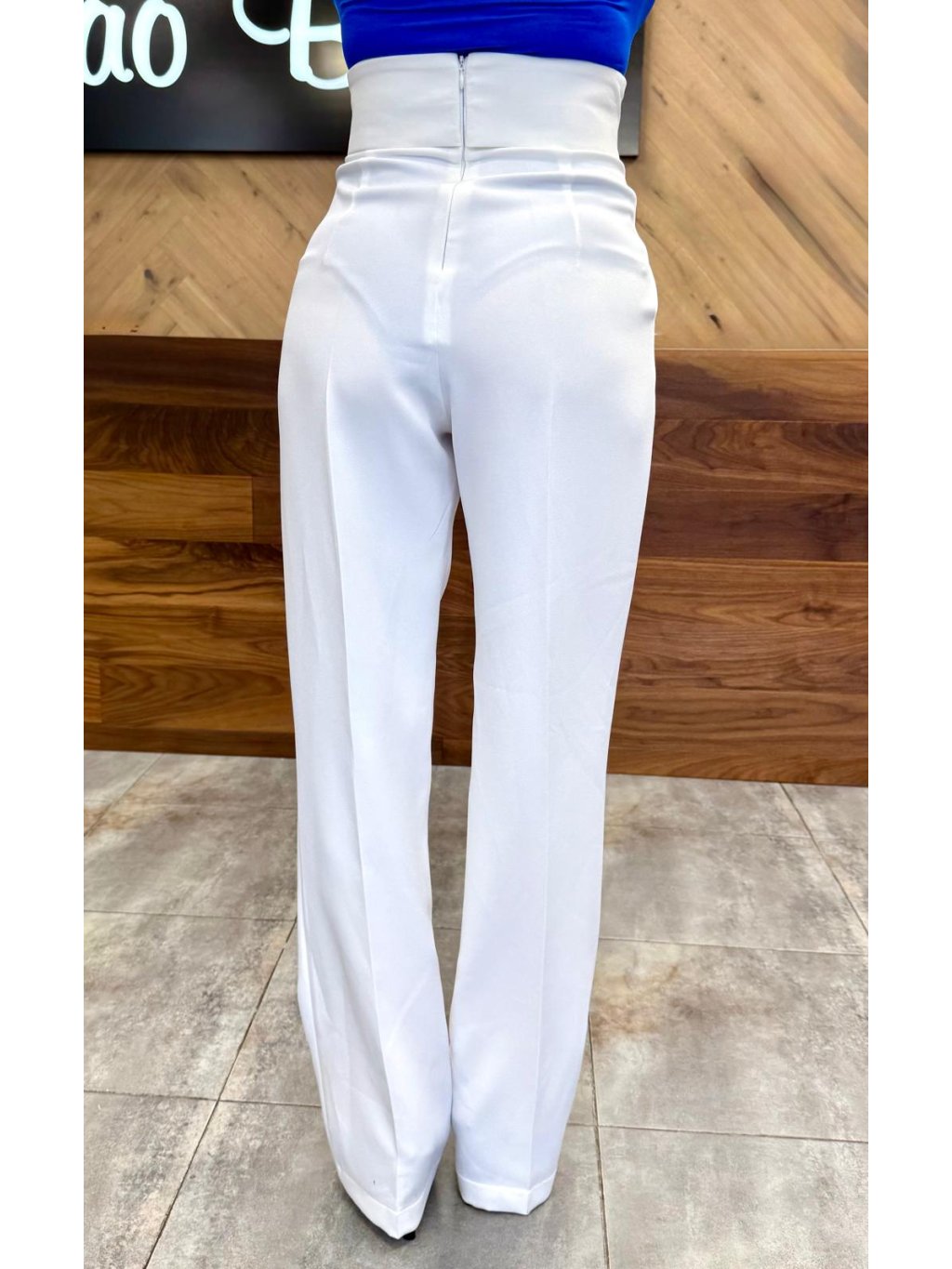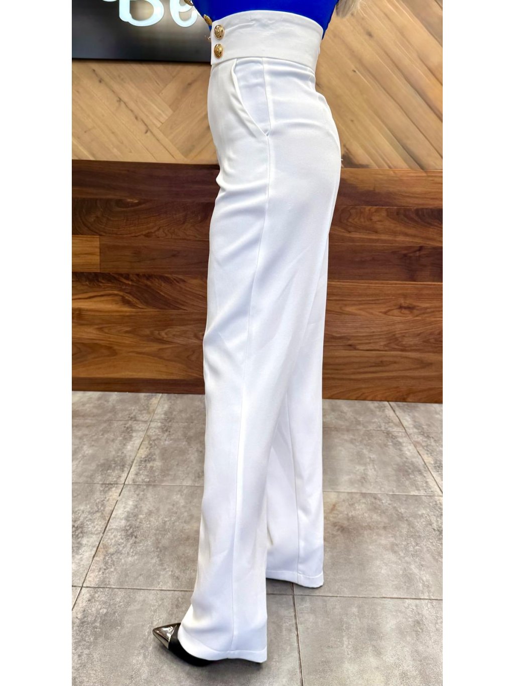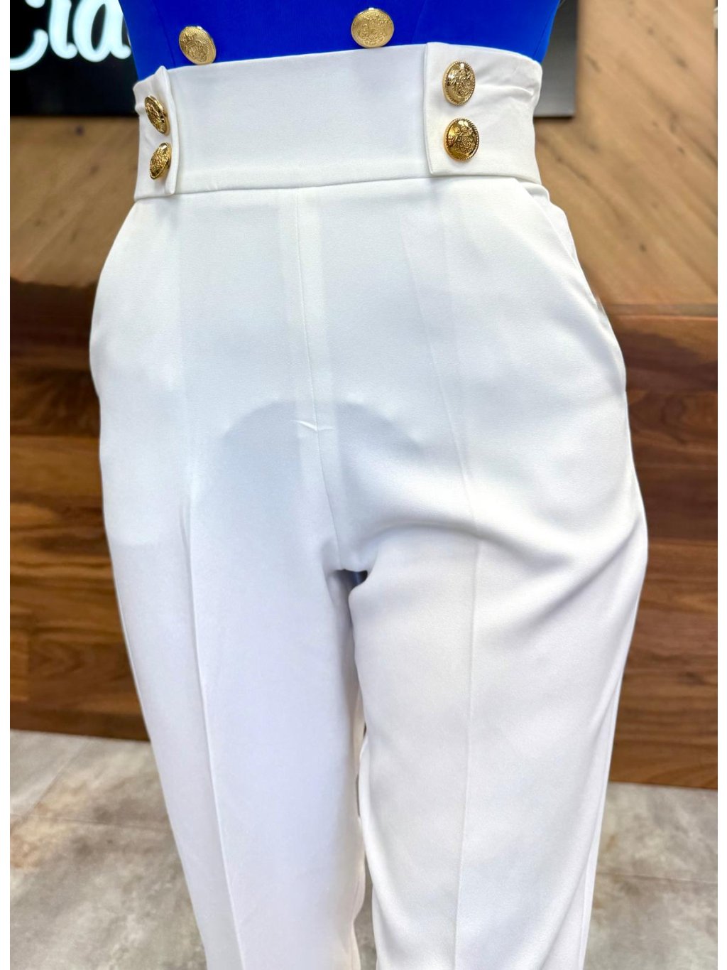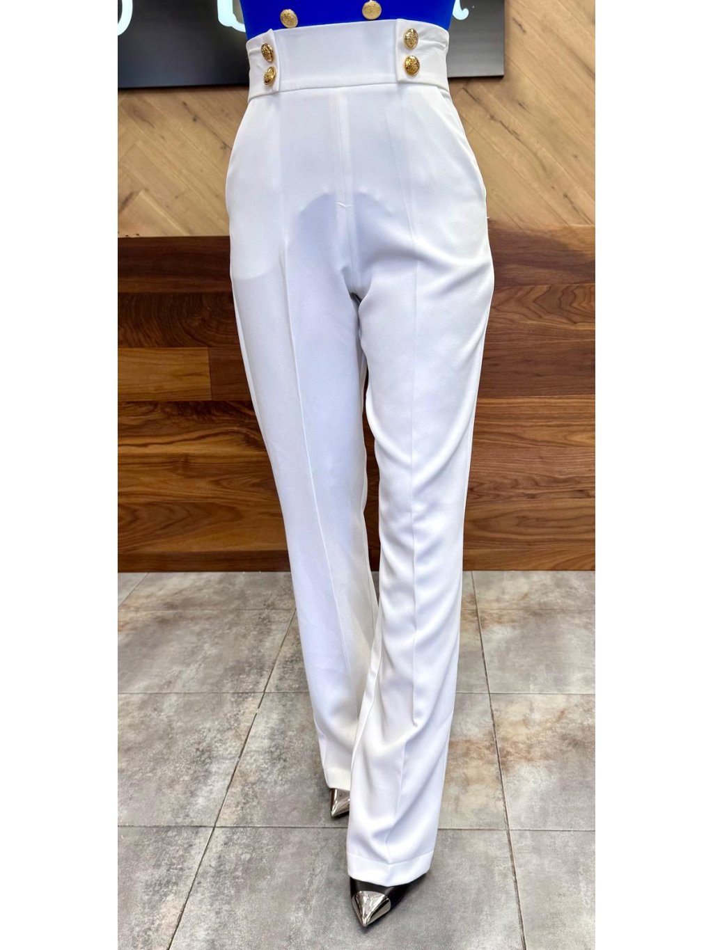 🤍 Luxusné biele nohavice ELENORA vynikajú vysokým pásom, ktorý krásne zvýrazní postavu a opticky predĺži nohy. Zlaté gombíky na páse im dodávajú elegantný, až kráľovský nádych a rovný strih s pukmi pôsobí mimoriadne sofistikovane.