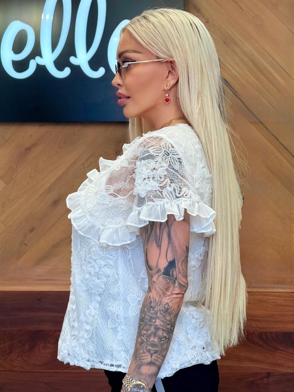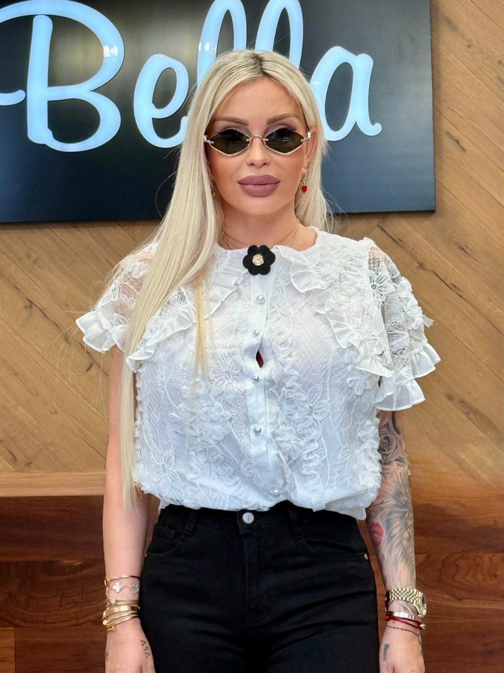 Jemná čipkovaná blúzka v bielej farbe, ozdobená volánmi a mašličkou pri krku. Perfektne doladí každý elegantný aj romantický outfit.