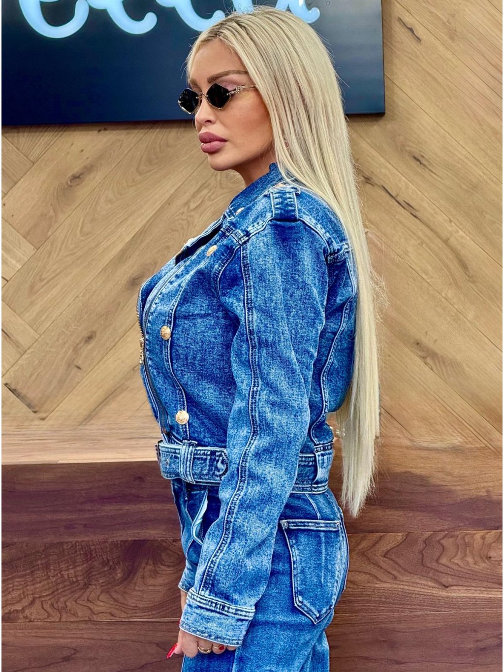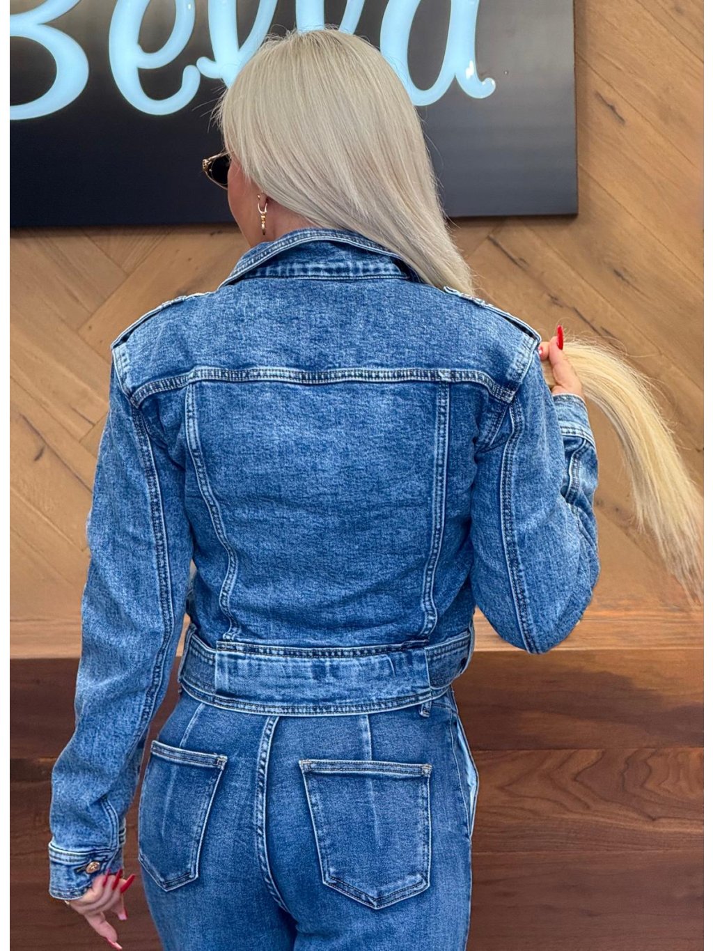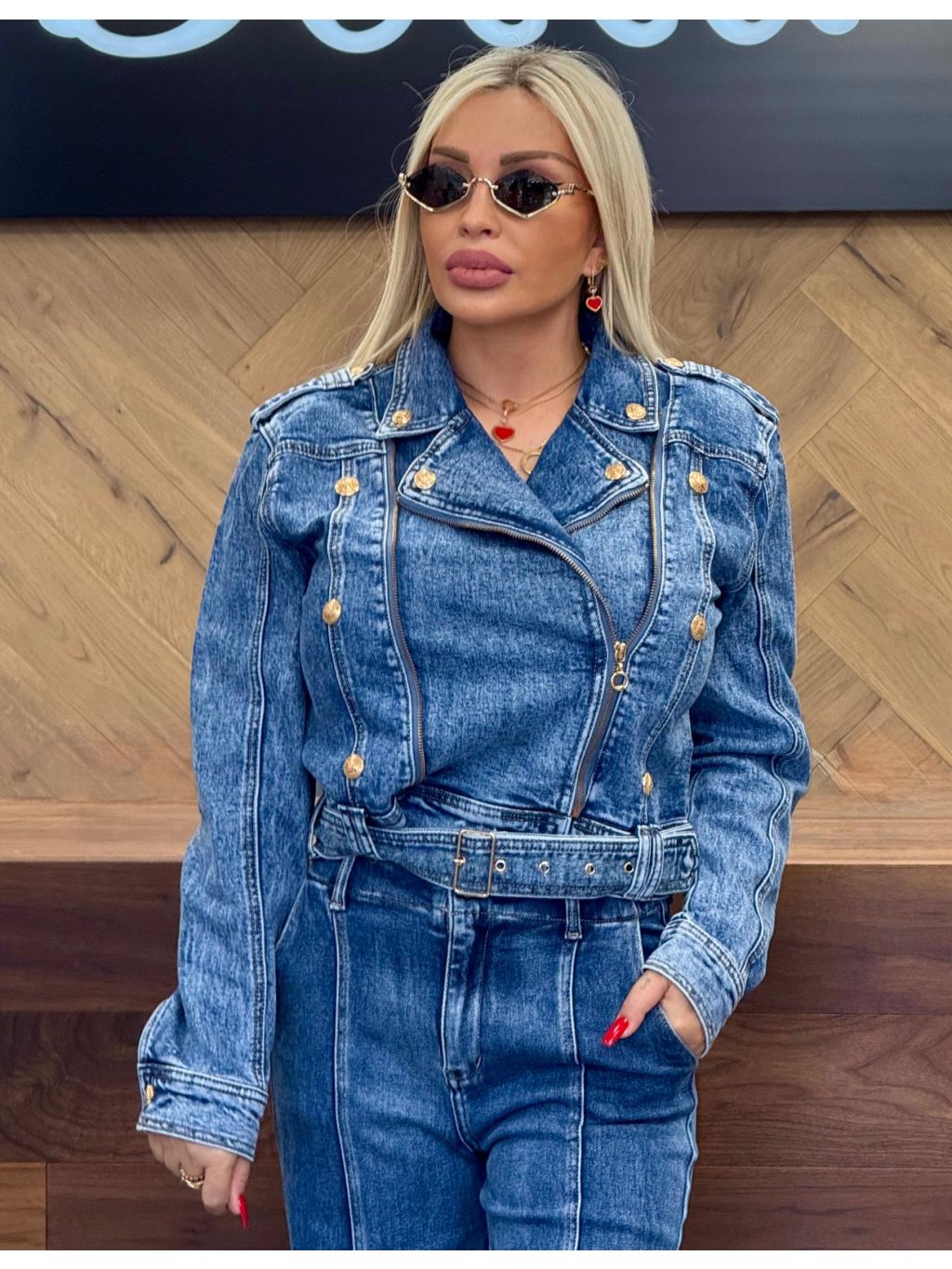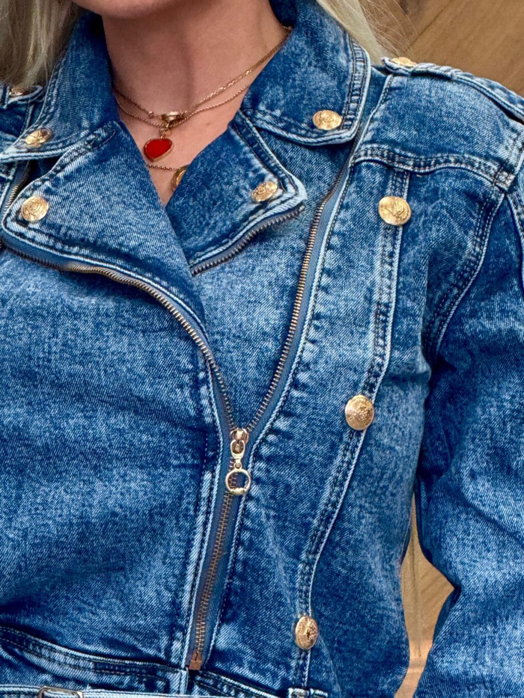 Ikonický štýl v kráľovskom prevedení! Rifľová bunda AMELIA zaujme na prvý pohľad vďaka zlatým detailom a netradičnému strihu. Luxusné gombíky a šikmé zipsy dodávajú tomuto kúsku eleganciu, ktorá sa len tak nevidí. Vďaka kvalitnej rifľovine a prepracovanému šitiu ide o bundu, ktorá pôsobí exkluzívne a zároveň moderne.