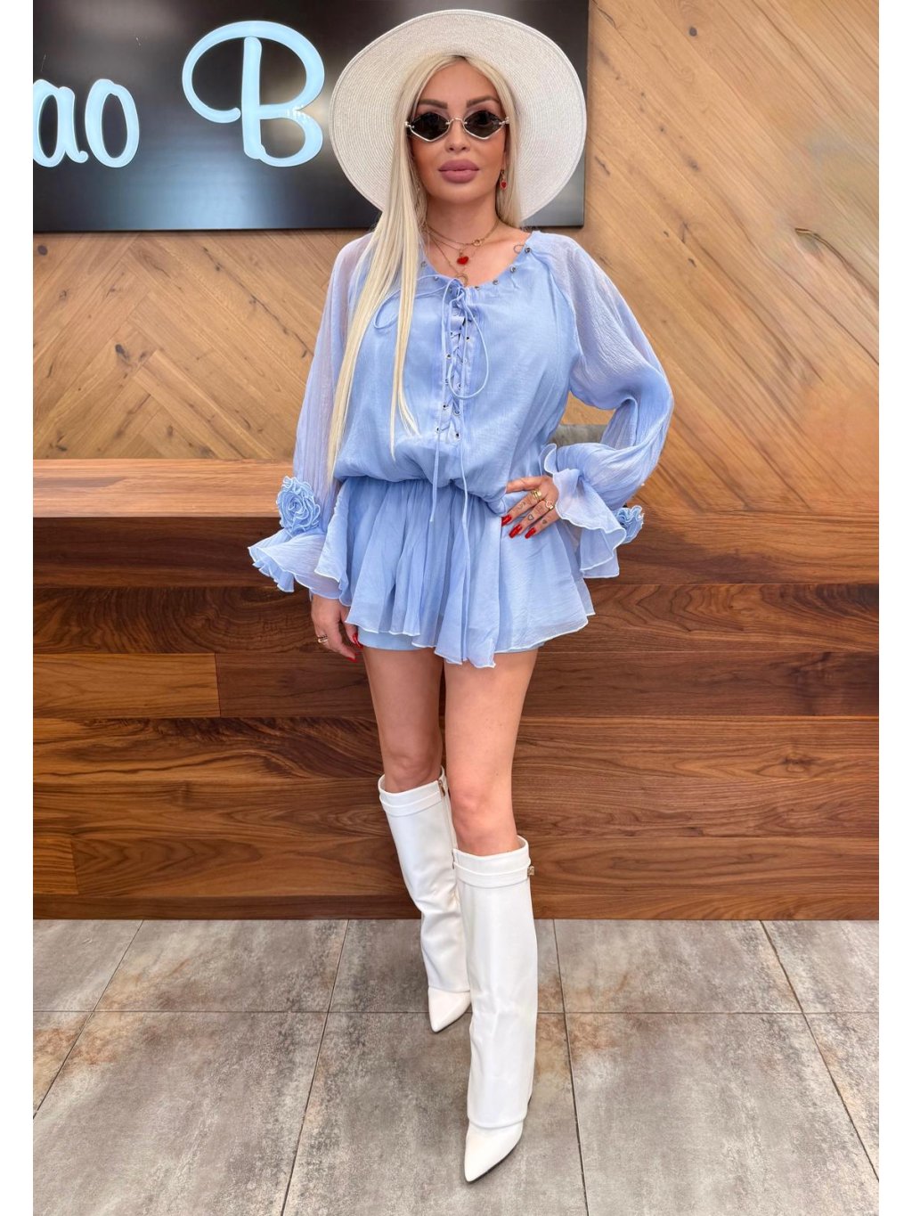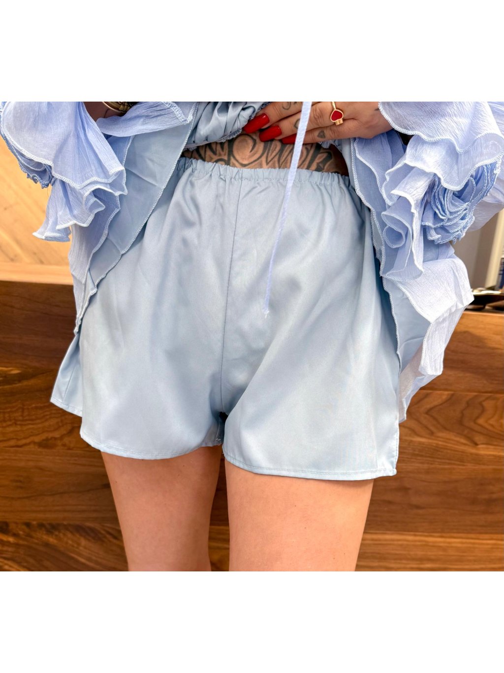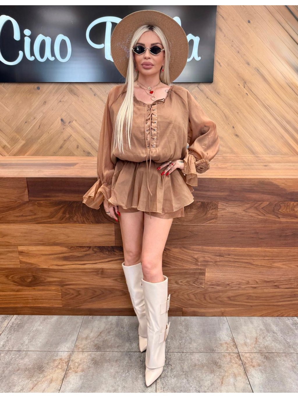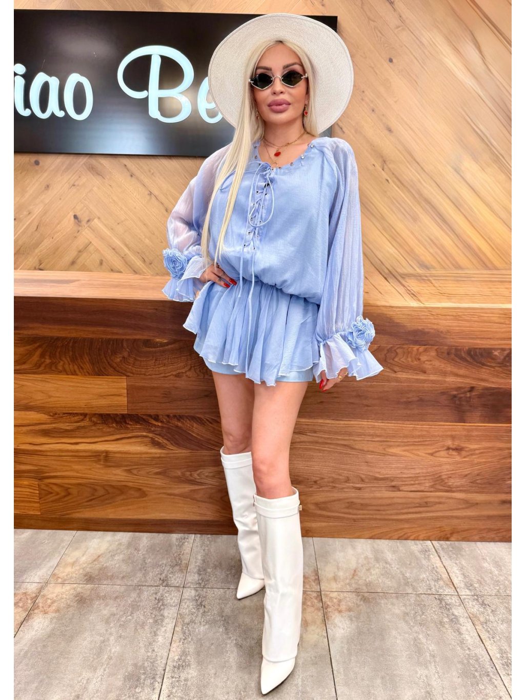✨ Komplet ELIZABETA – keď sa elegancia spojí so zmyselnosťou! Tento výnimočný set ťa okamžite premení na kráľovnú večera aj dňa. Romantická blúzka s jemne nadýchanými rukávmi a originálnym šnurovaním vpredu pôsobí neodolateľne, zatiaľ čo šortky dodávajú outfitu pohodlie a slobodu pohybu. Látka krásne splýva, ľahko sa nosí a lichotí každej postave – sadne od XS až po L.
