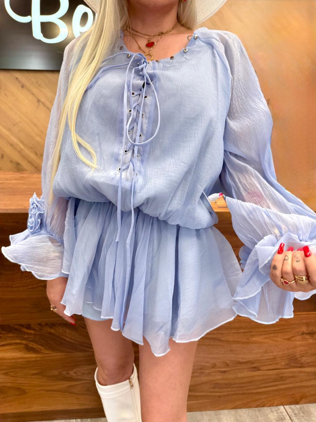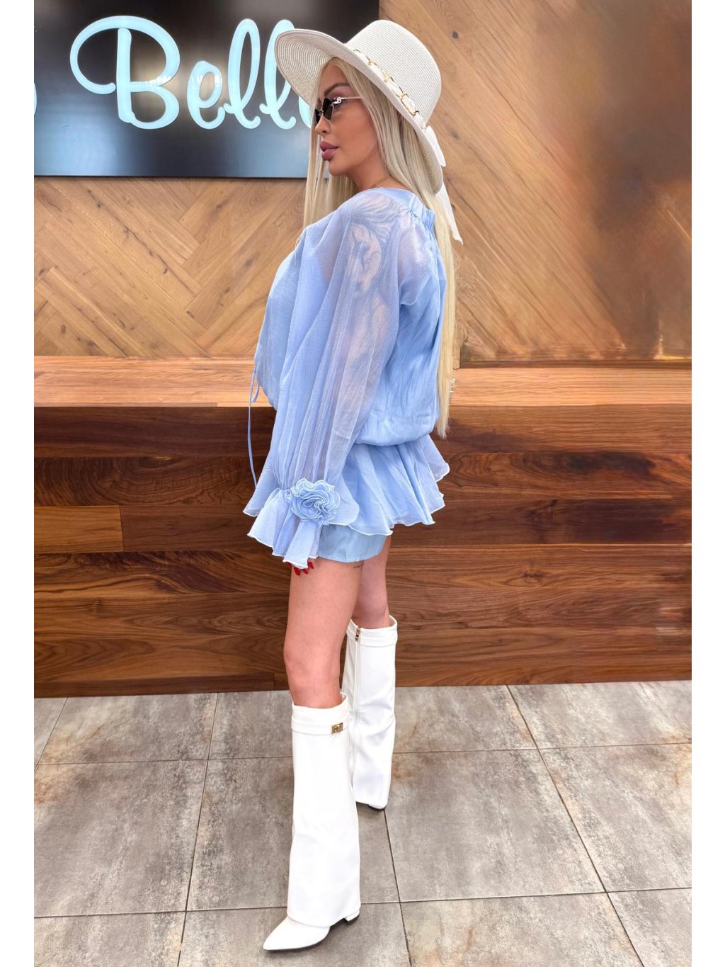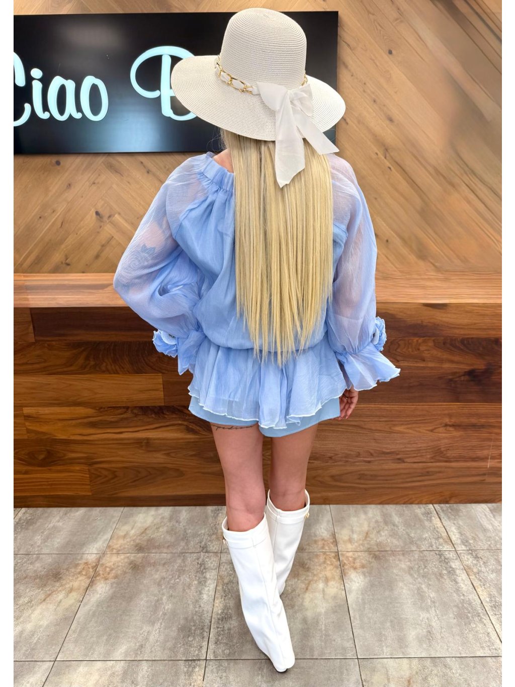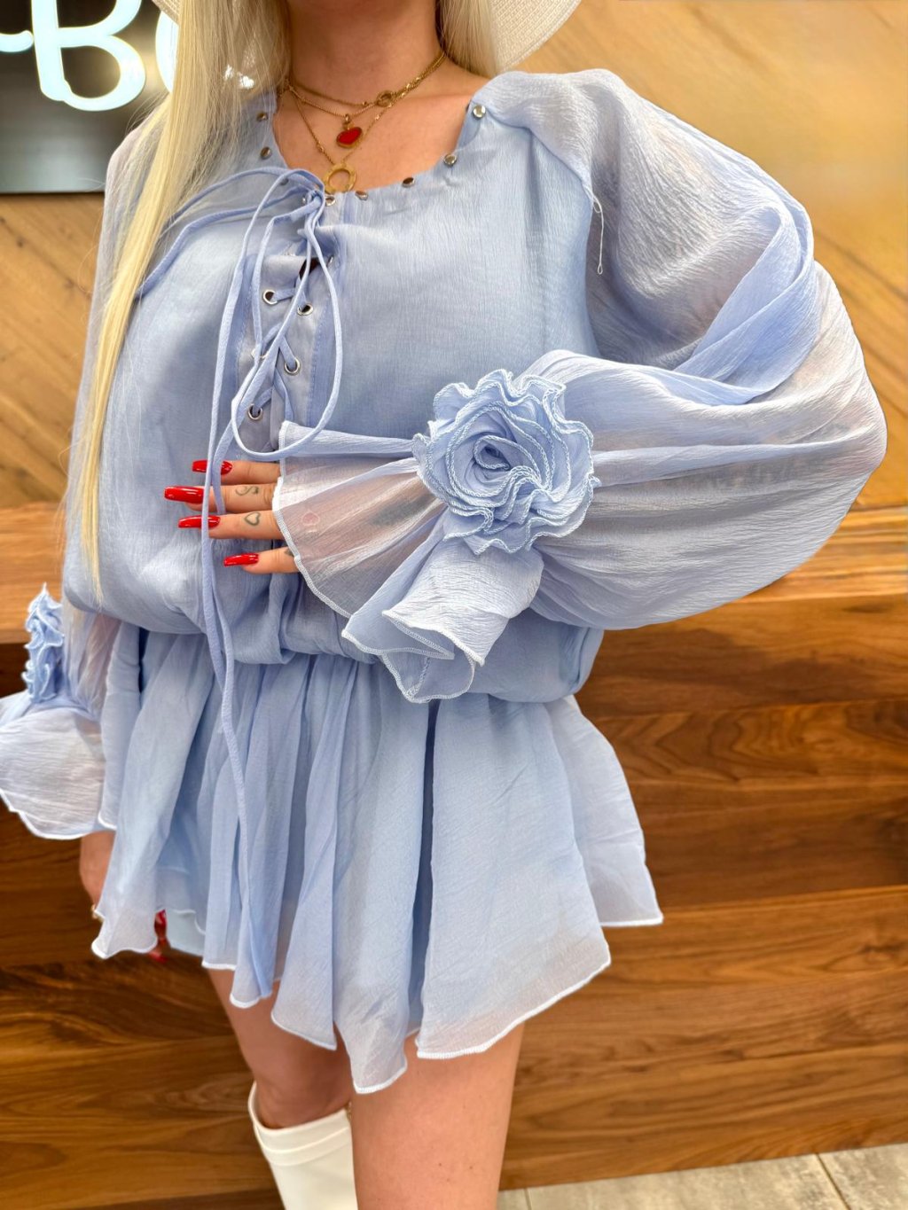 ✨ Komplet ELIZABETA – keď sa elegancia spojí so zmyselnosťou! Tento výnimočný set ťa okamžite premení na kráľovnú večera aj dňa. Romantická blúzka s jemne nadýchanými rukávmi a originálnym šnurovaním vpredu pôsobí neodolateľne, zatiaľ čo šortky dodávajú outfitu pohodlie a slobodu pohybu. Látka krásne splýva, ľahko sa nosí a lichotí každej postave – sadne od XS až po L.