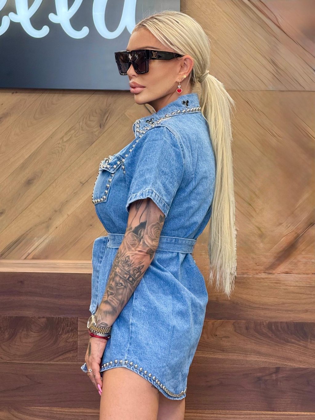 Košeľa alebo šaty? ELZA ti dáva slobodu výberu. Tento výrazný denimový model s krátkym rukávom zdobia kamienky a kovové cvoky, ktoré z neho robia neprehliadnuteľný statement kúsok. Môžeš ju nosiť k legínam ako dlhšiu košeľu alebo samostatne ako šaty – záleží len na tebe.