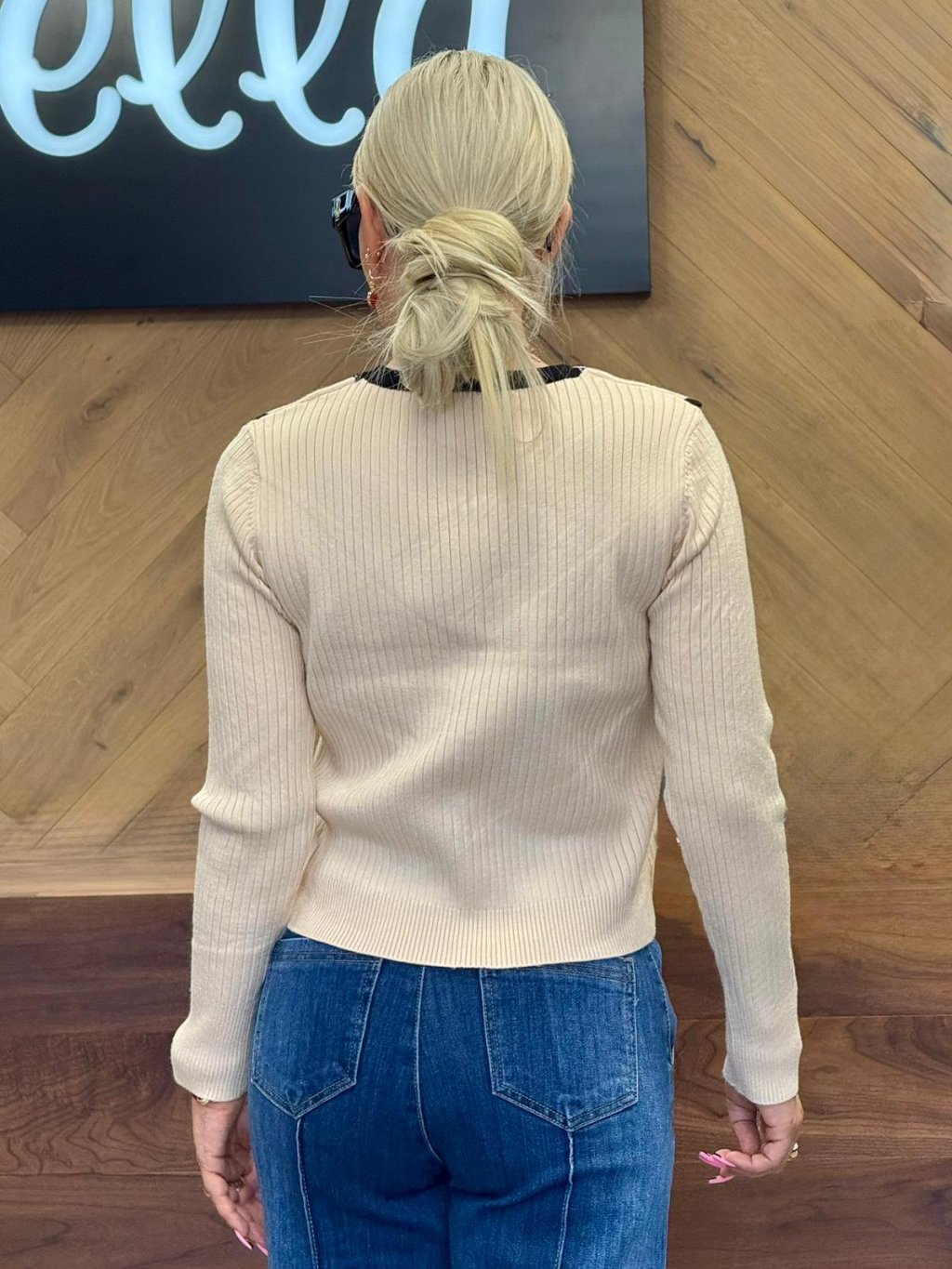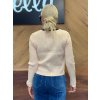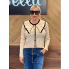 Pulóver BLAŽENA je ako vystrihnutý z vintage magazínu – no zároveň pôsobí sviežo a nadčasovo. Vďaka rebrovanej pletenine krásne obopne postavu a kontrastný golier so zúbkovaným lemom mu dodáva romantický šmrnc. Zlaté gombíky podčiarknu celý outfit a premenia ho na niečo výnimočné.