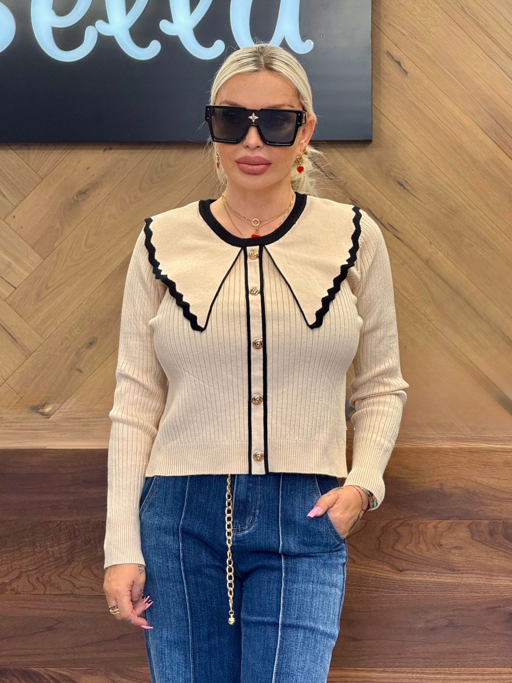 🤍 Zdobený kontrastným golierom so zúbkovaným lemovaním