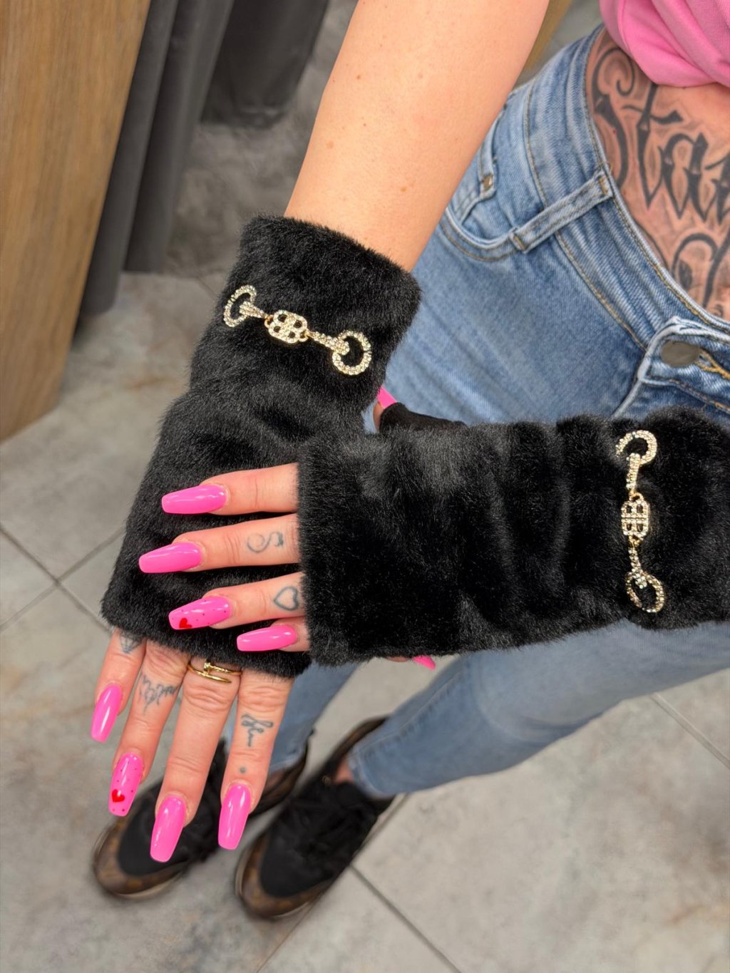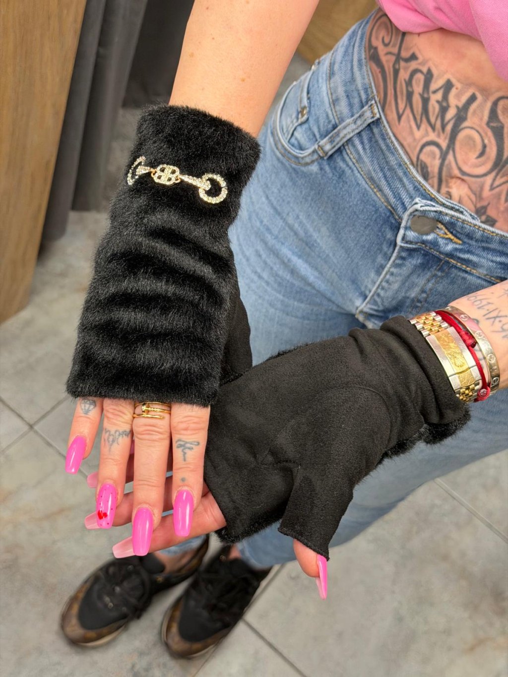 Doplnok, ktorý vyzerá luxusne a zároveň je praktický. Bezprstové rukavice s jemnou kožušinkou na vrchu a brúseným povrchom zo spodnej strany pôsobia elegantne, štýlovo a perfektne dotvoria zimný aj prechodný outfit. Zlatý detail dodáva rukaviciam prémiový vzhľad a robí z nich výrazný módny prvok.