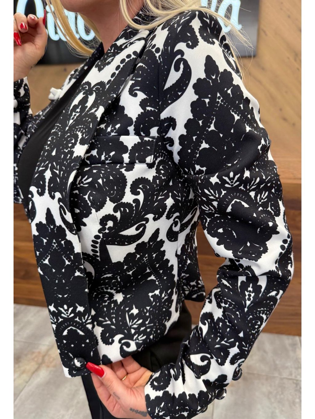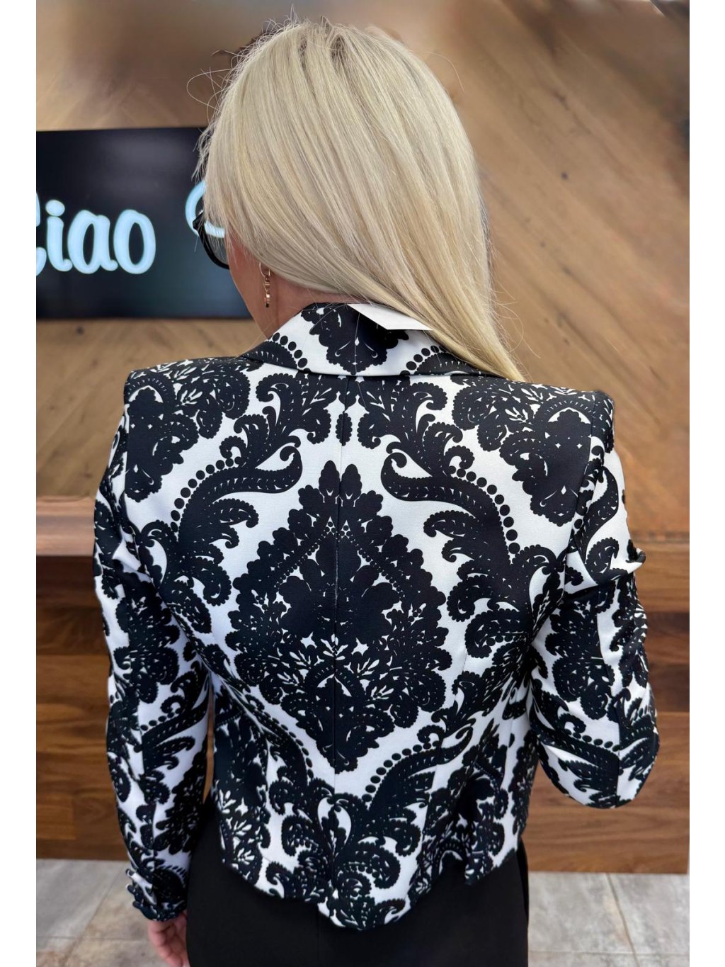 💎 Extravagantné a luxusné! Sako BAROQUE v ikonickom čierno-bielom barokovom vzore je kúskom, ktorý okamžite pritiahne pozornosť. Kratší elegantný strih dodáva moderný nádych, zatiaľ čo nadčasový vzor pôsobí sofistikovane a noblesne.