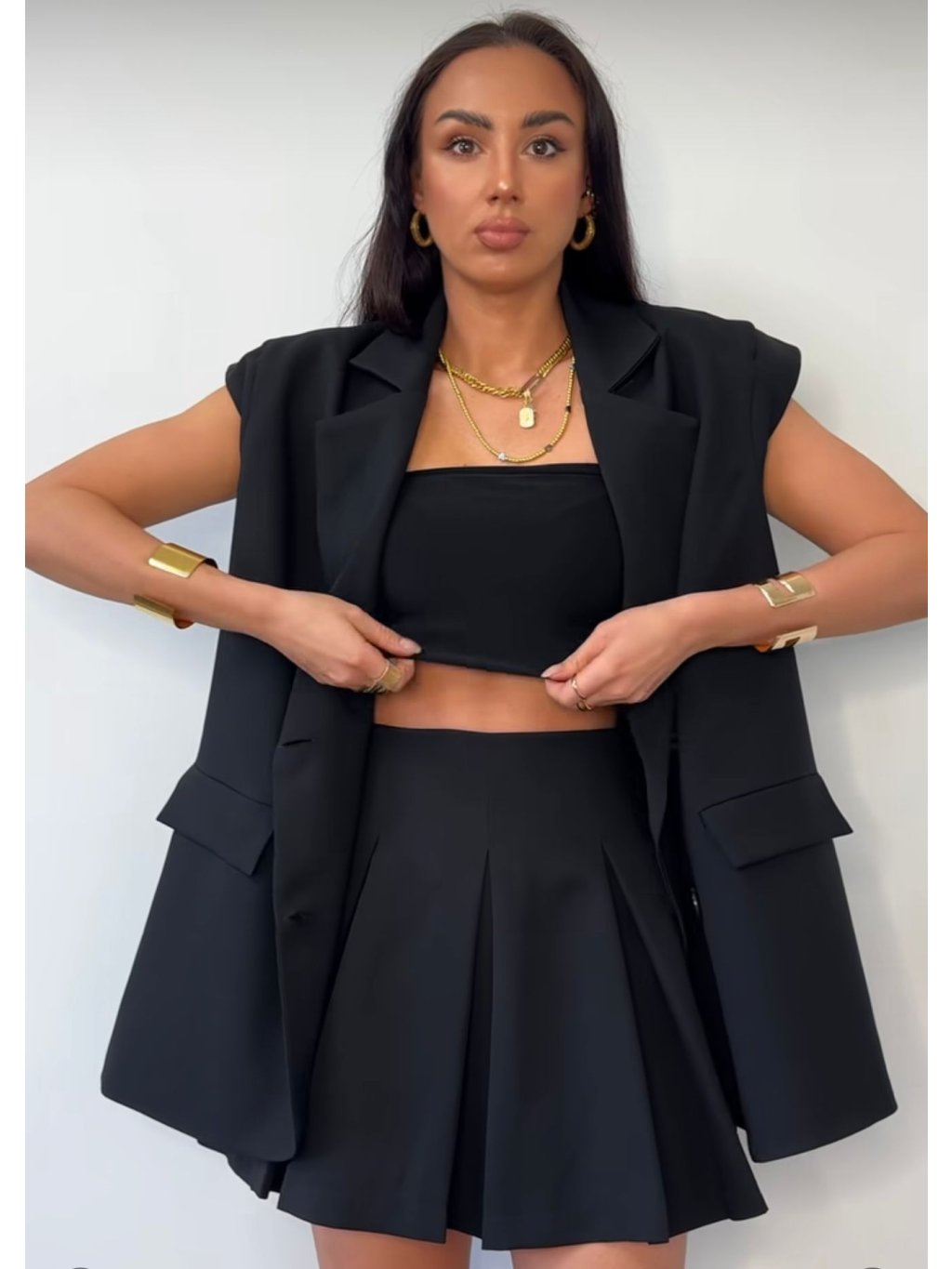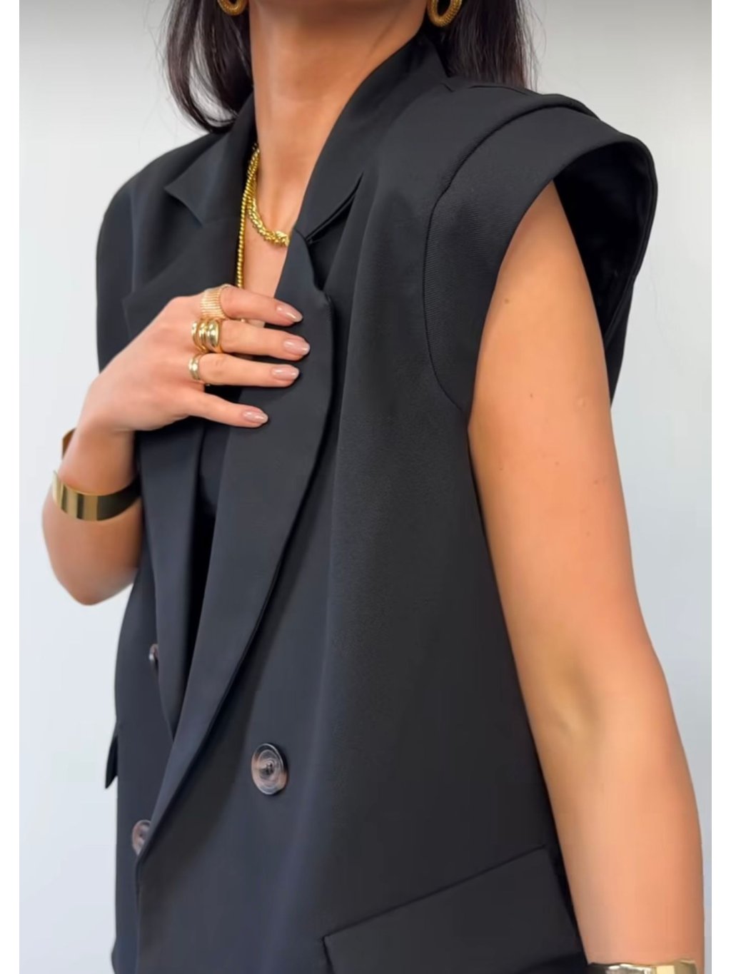Táto vesta je dokonalým základom pre moderný šatník – skombinujte ju s elegantnými nohavicami do práce, s rifľami na bežný deň alebo s mini šatami na večer. Jednoduchá čierna farba vám otvorí nekonečné možnosti kombinovania.
