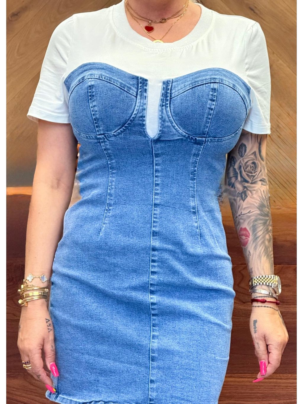 💙 Originálne, mladistvé a svieže! 💙 Šaty JEANETTE kombinujú pohodlie bieleho trička s rifľovým živôtikom a sukňou v jednom štýlovom kúsku. Tento neprehliadnuteľný model ti dodá šmrnc a sebavedomie, nech už ich vezmeš na prechádzku mestom, párty alebo rande. Ležérne a pritom výnimočné — stačí obliecť a vyraziť!