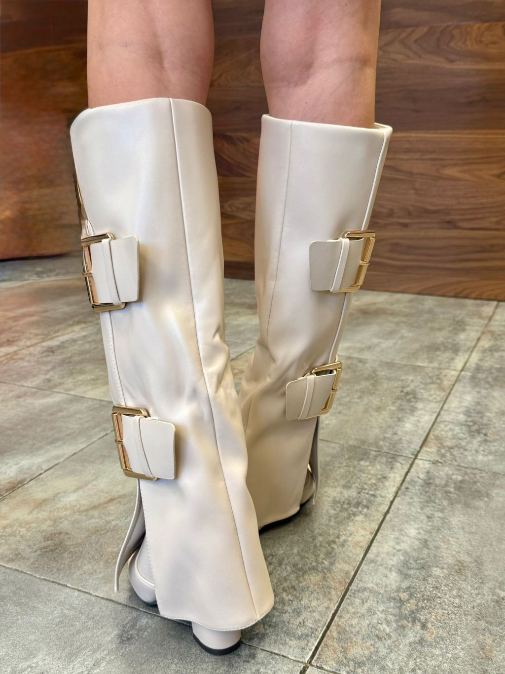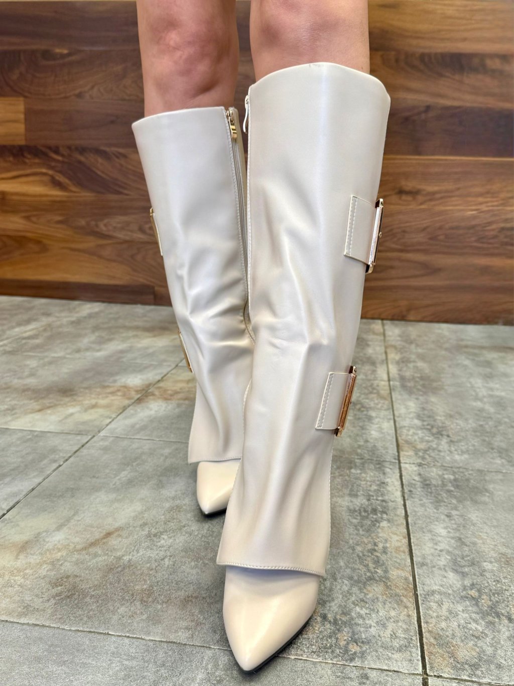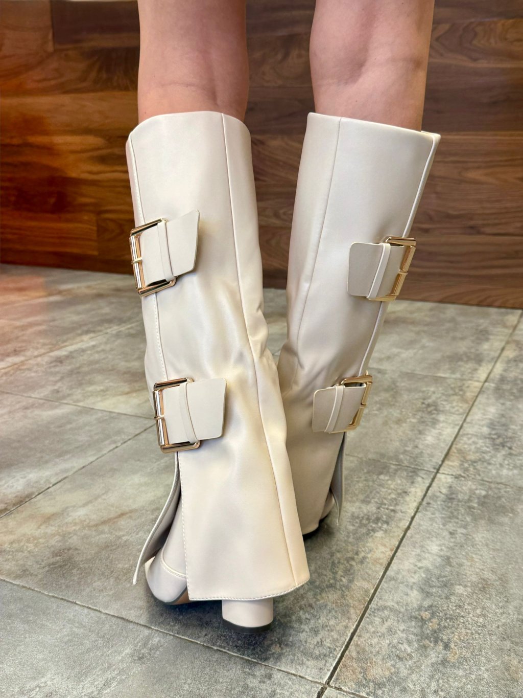 Túžiš po extravagantnom kúsku, ktorý rozžiari tvoj outfit? Čižmy CASSIE v béžovej farbe sú elegantné, výrazné a originálne vďaka širokým remienkom so zlatými prackami. Ich moderný dizajn a pohodlný podpätok ti dodajú sebavedomie a štýl, či už ich obuješ k šatám, sukni alebo úzkym nohaviciam.