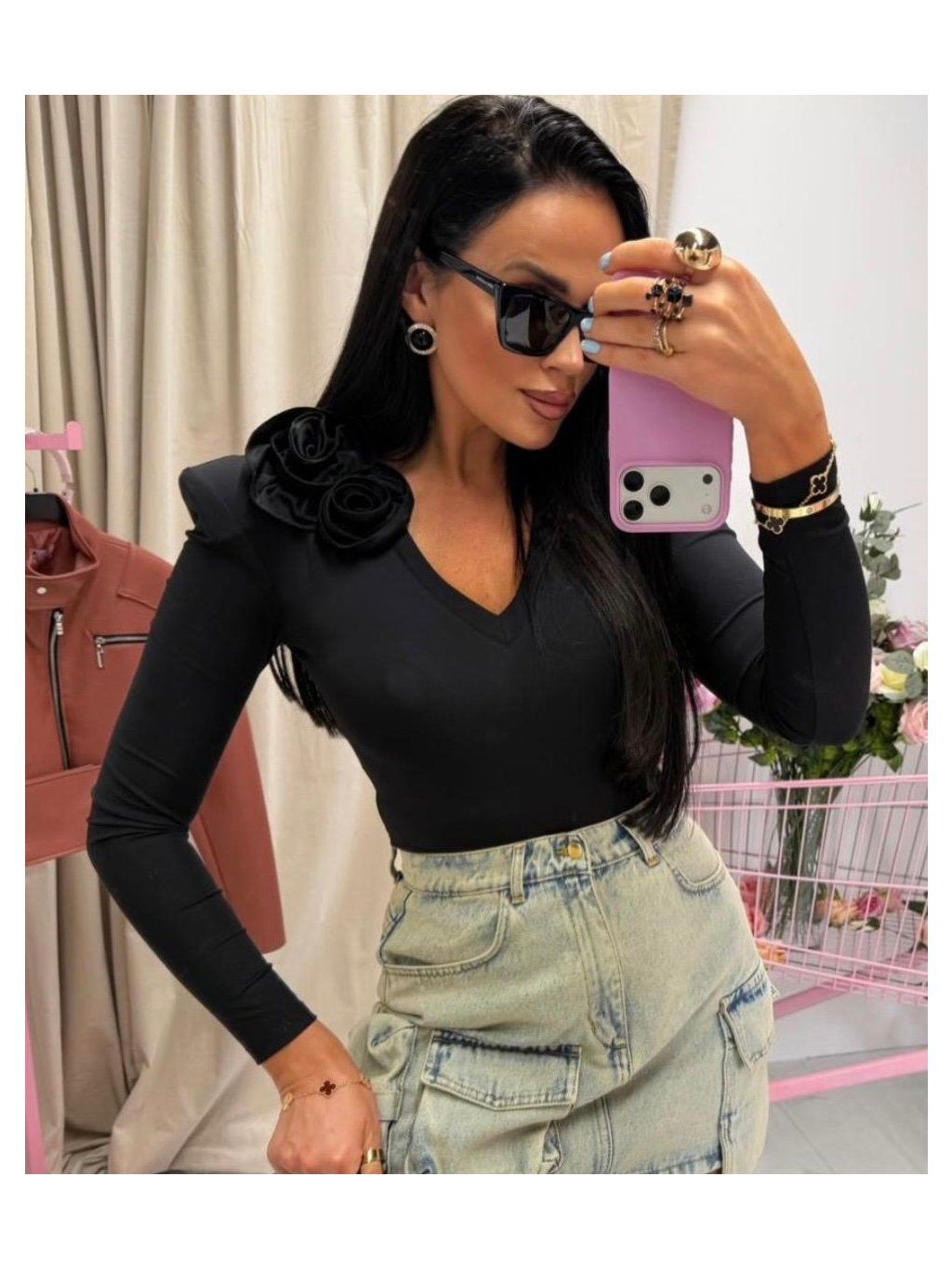 Dominantou body je výrazná textilná ruža na ramene, ktorá vytvára luxusný detail a robí z tohto kúsku skutočný statement. Je to presne ten typ topu, ktorý nepotrebuje veľa doplnkov – stačí ho skombinovať s rifľami, elegantnými nohavicami alebo sukňou a outfit okamžite pôsobí premyslene a štýlovo.