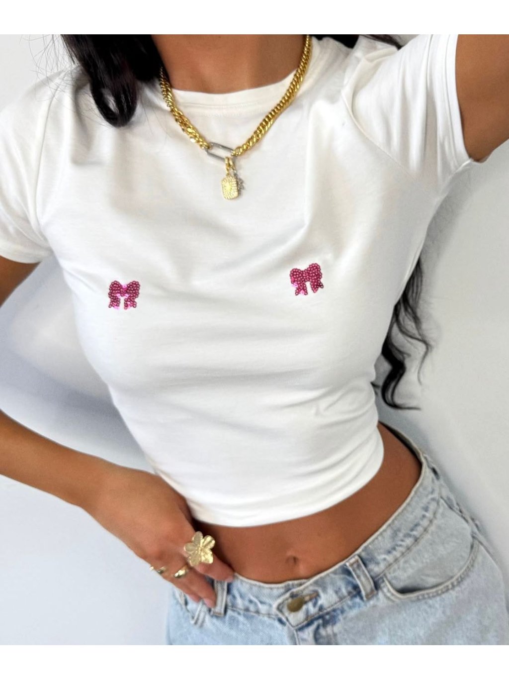 Minimalizmus s nádychom hravosti! Tričko FIOCCO pôsobí čisto a elegantne, no vďaka dvom ružovým mašličkám vpredu získava jedinečný charakter.