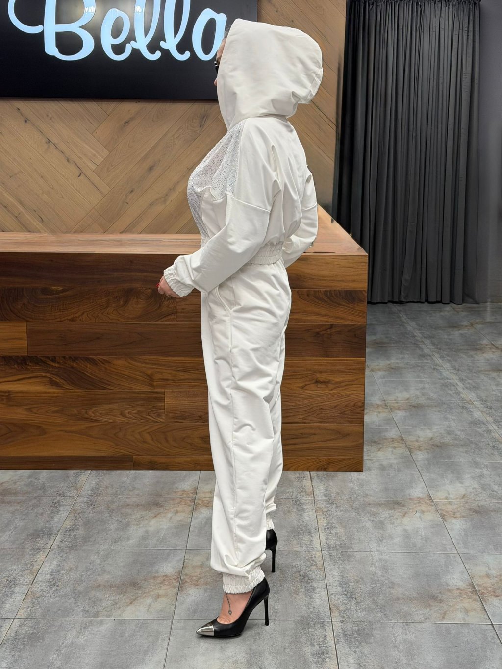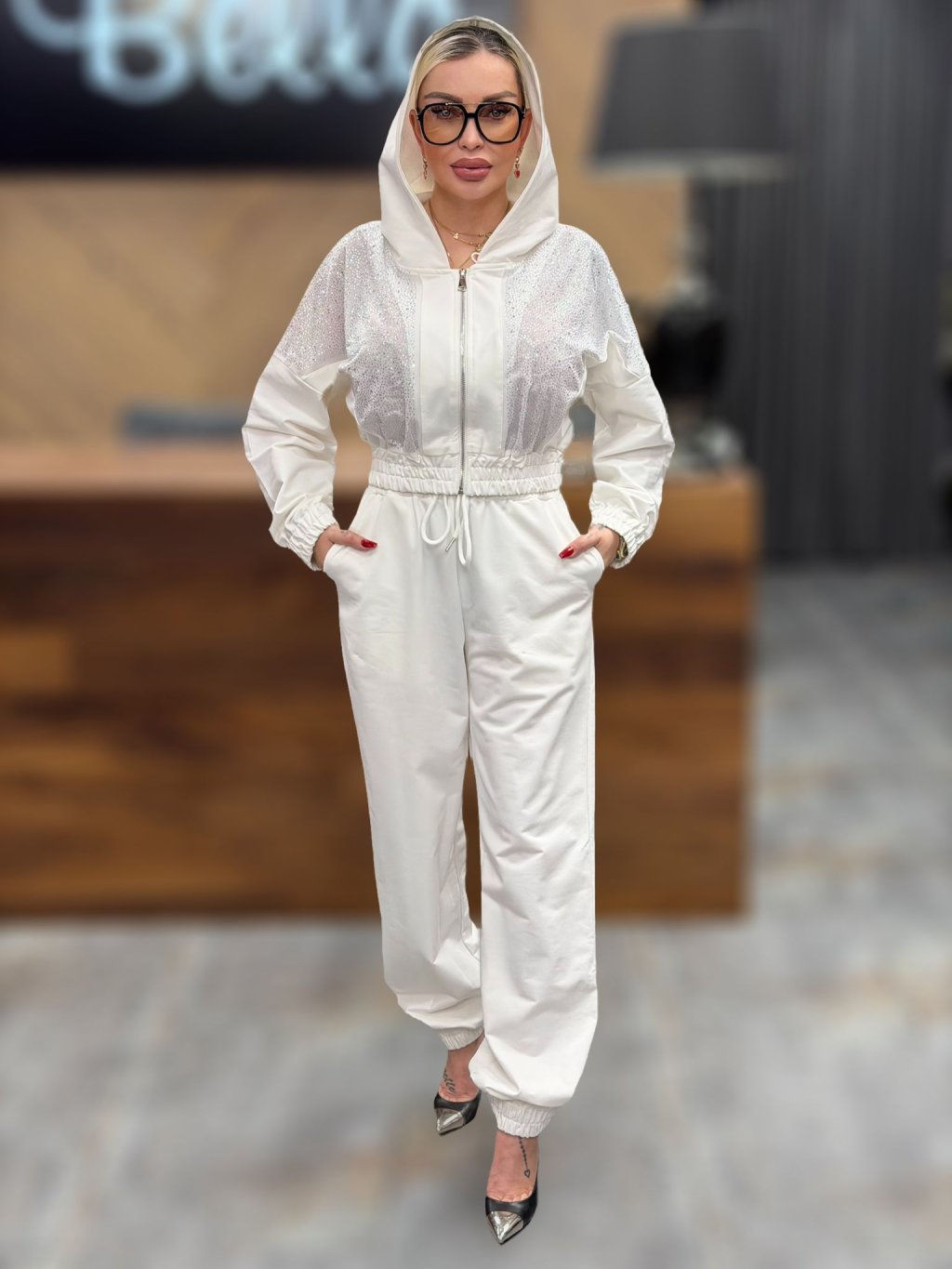Predná časť mikiny je bohato zdobená trblietavými kamienkami, ktoré okamžite pritiahnu pohľad a dodajú outfitu exkluzívny glamour efekt. Zadná časť ostáva hladká a čistá, vďaka čomu mikina nepôsobí prehnane, ale elegantne a nositeľne. Kapucňa a zips dodávajú športovo-luxusný vibe, zatiaľ čo elastické zakončenia krásne držia tvar.
