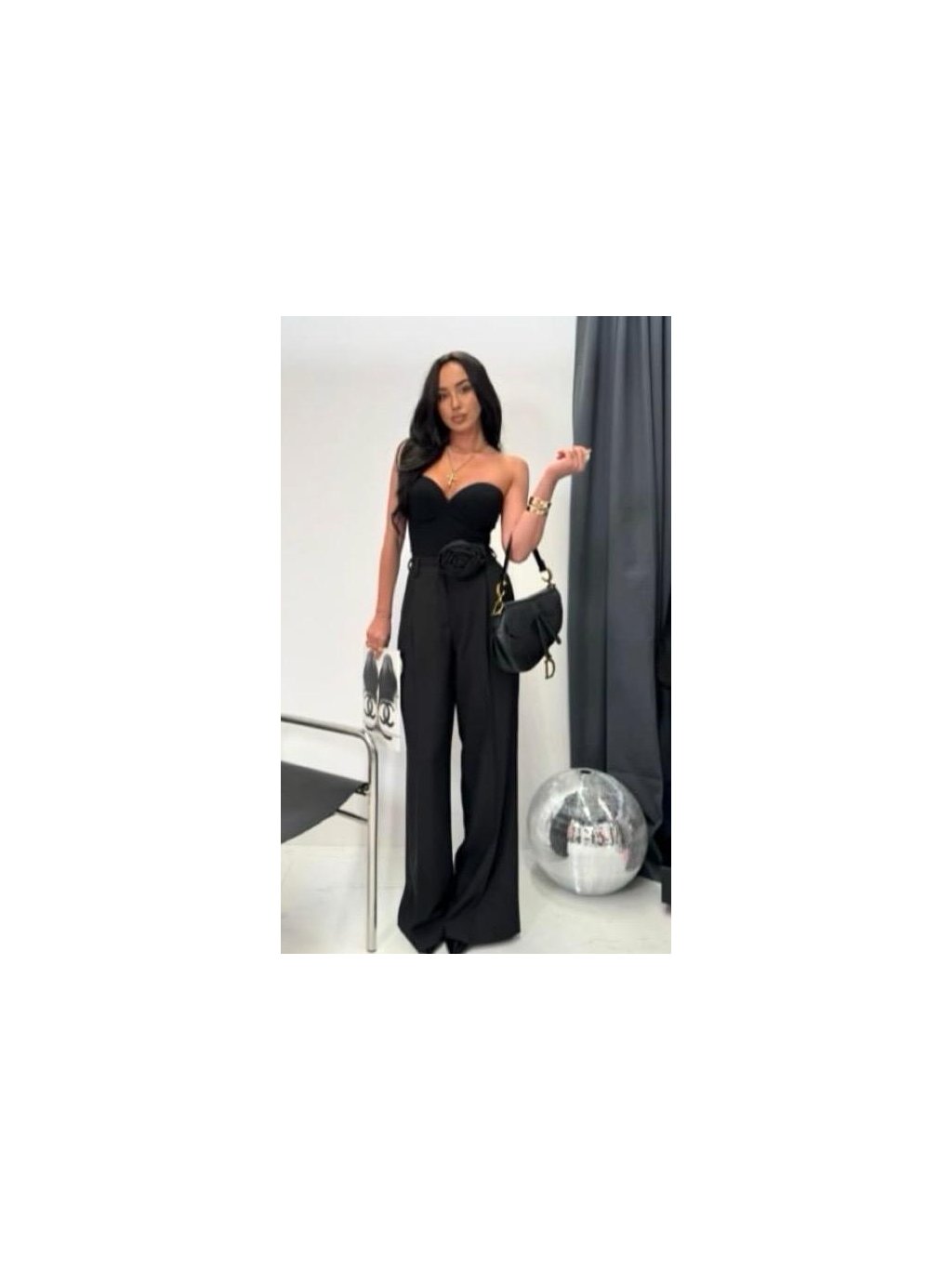 Vysoký pás krásne formuje postavu a opticky predlžuje nohy, zatiaľ čo splývavý strih dodáva outfitu noblesu a pohybovú ľahkosť. Ruža v páse pôsobí elegantne, romanticky a zároveň veľmi moderne – ideálna voľba pre ženy, ktoré milujú luxus s charakterom.