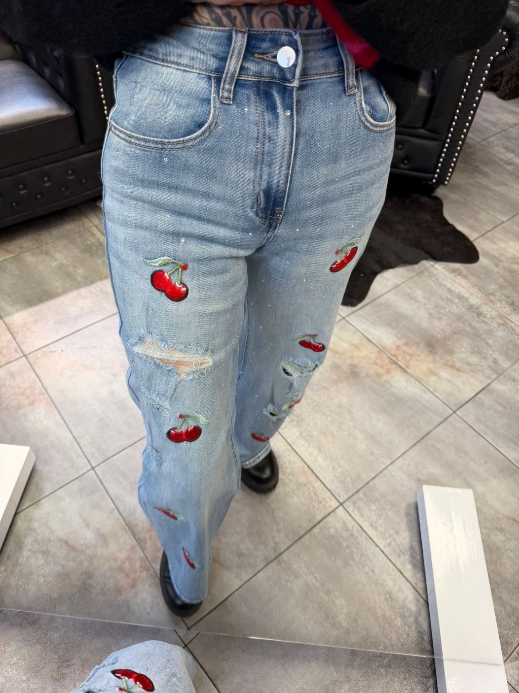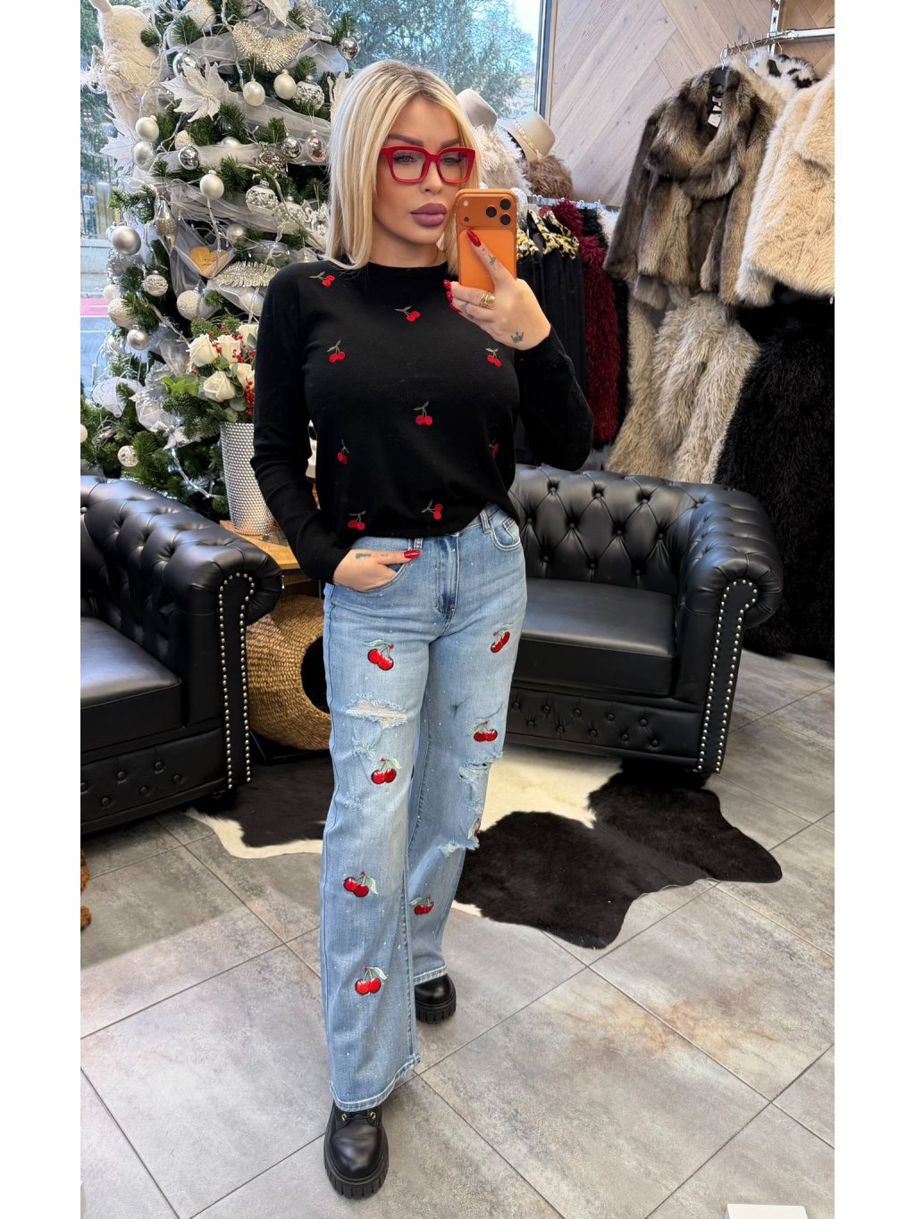 Rifle AMARENA sú hravým a trendovým kúskom, ktorý okamžite upúta pozornosť. Svetlomodrý denim zdobia výrazné vyšívané čerešne, ktoré dodávajú rifliam mladistvý, veselý a zároveň veľmi štýlový nádych.